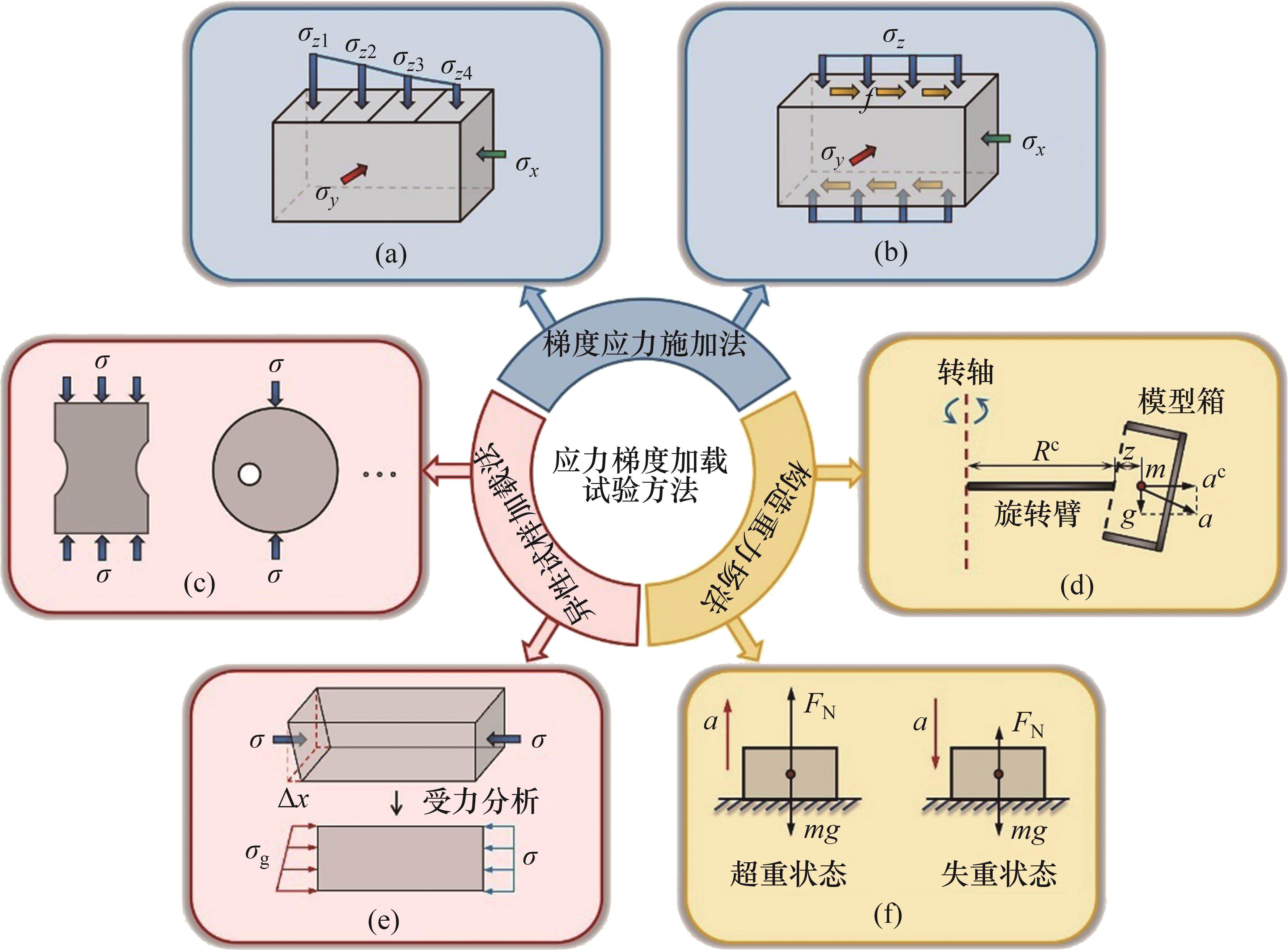 在采用构造重力场法开展应力梯度研究方面,与其他几种方法相比,由土工离心机高速旋转构造的超重力场试验方法虽然能够对较大尺寸试样进行试验,但该方法存在离心力场分布不均匀、无法模拟大尺度试样的弊端。空基和陆基试验主要用于探究深空岩石力学特性。且空基试验成本高,机会很少。陆基试验受环境影响大,稳定性差,持续时间短。这些弊端导致采用空基和陆基的岩石应力梯度试验研究难以开展。
