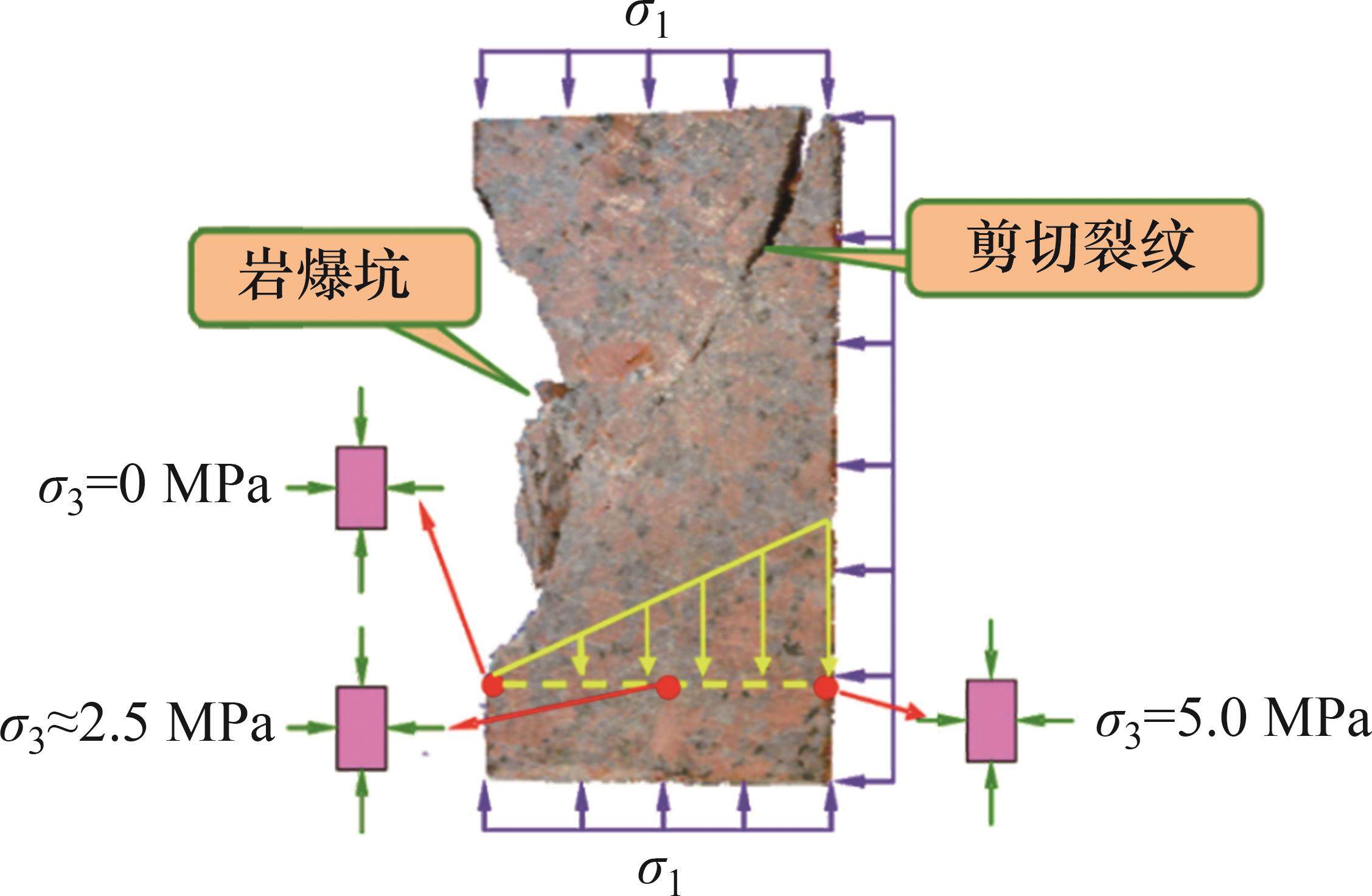 基于这种试验设计思路,SU等[78, 87]对真三轴加载装置进行了改进,使其具有三向六面压缩条件下单面快速卸载的功能,可模拟地下工程开挖瞬间围岩应力路径急剧变化的过程,从而实现了岩石试样y方向的应力梯度加载。试验设备如图4(c)所示。采用该设备开展岩石力学试验发现,随着径向应力梯度增大,岩石强度不断提高,失效模式由以拉伸劈裂为特征的应变岩爆转变为以剪切破裂为特征的应变岩爆,在应变岩爆过程中,弹射碎片的动能显著增大。图7所示为试样破坏模式及梯度应力示意图[87]。