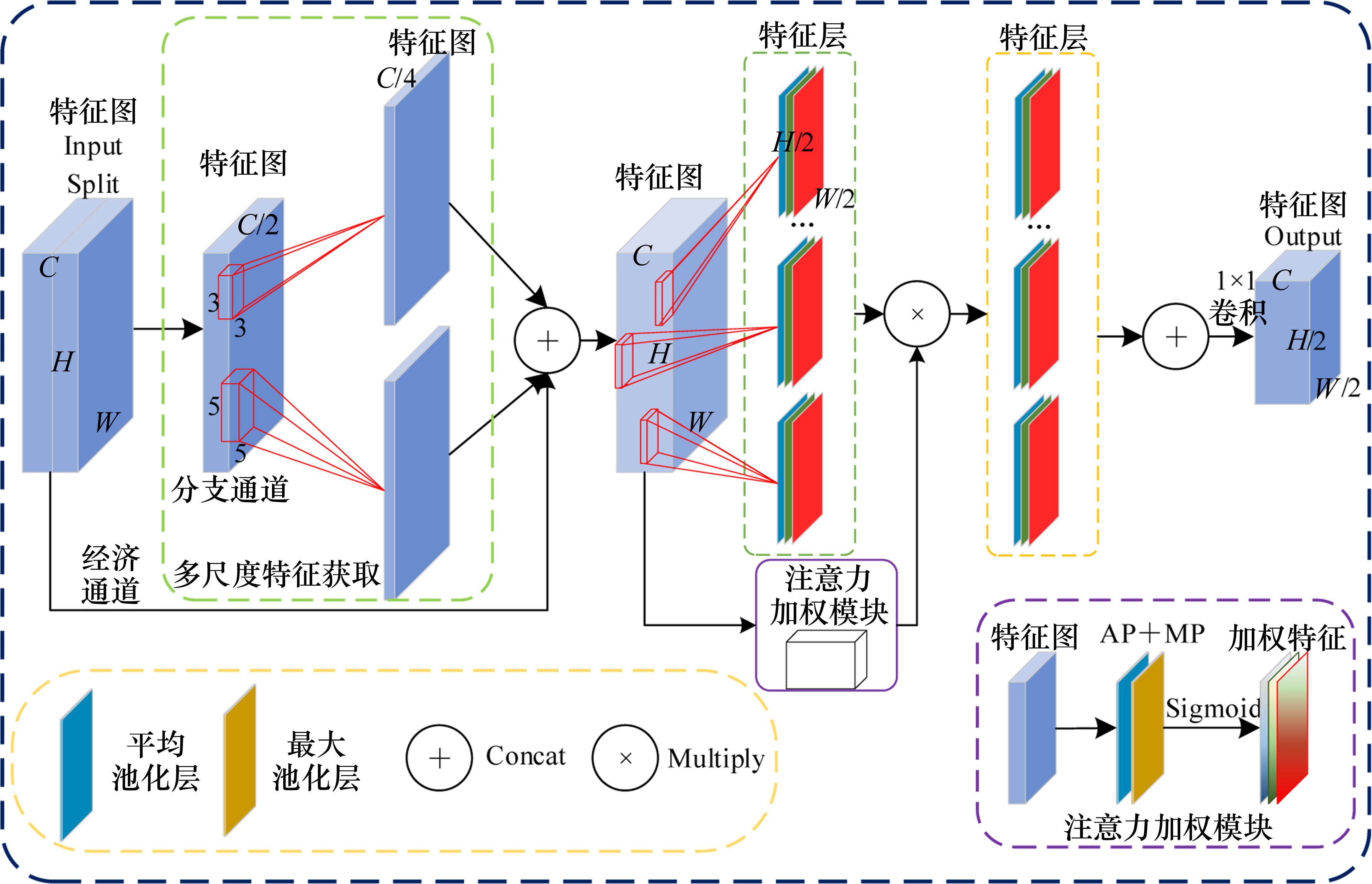 随后,将分支通道分为多组对每个分组通道进行多尺度卷积,每个分支都专注于不同感受野大小的特征提取,通过并行处理获得不同语境范围的渗水信息并有效提高对渗水的识别性能,值得注意的是这一操作中的分组数和每组中的卷积核大小是可变的,再通过合适的特征融合策略就能获得更全面丰富的特征表示,然后将经济通道和多尺度特征沿通道所有维度合并,得到输入形状的特征图,这样的设计使模型更加敏感于不同尺度下的渗水特征,从而提高渗水检测的精度。
