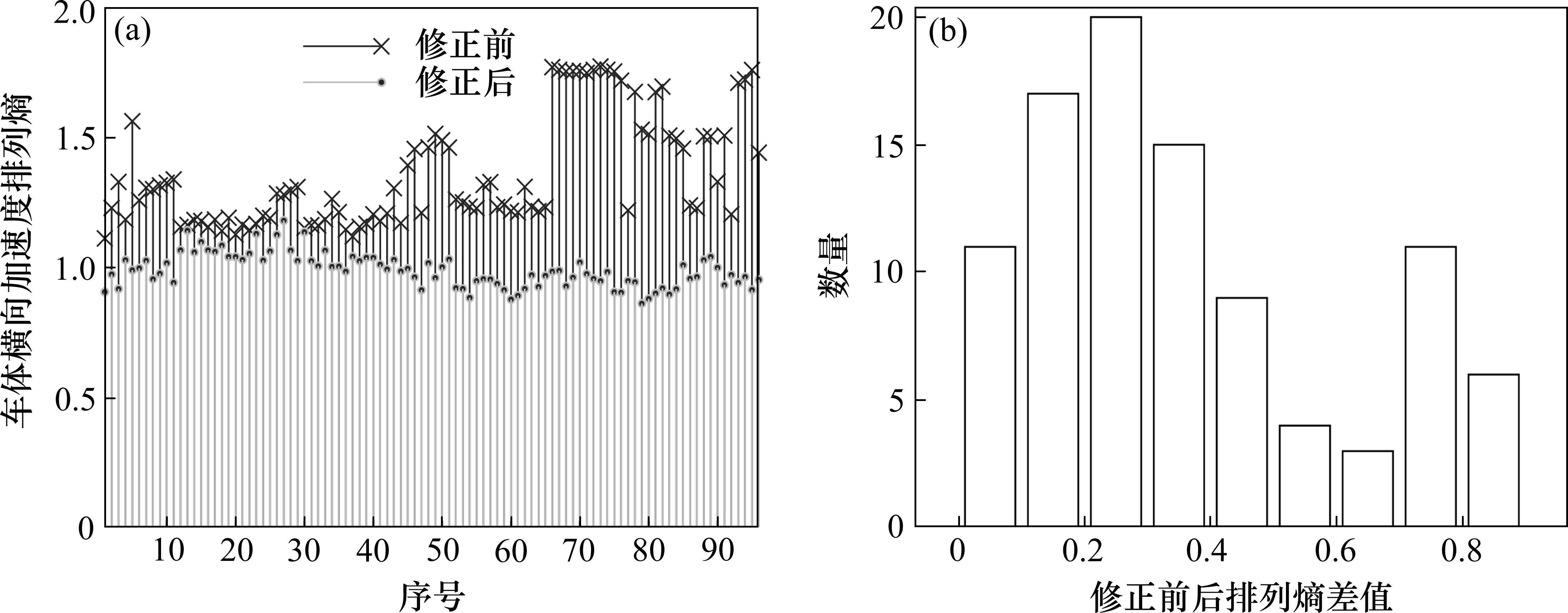 利用所提出的识别方法对高速综合检测列车以直向且速度超过100 km/h通过道岔时的28 000组数据进行分析,共计得到96组异常数据,异常率为0.34%。对96组含有局部毛刺成分的异常车体横向加速度进行修正后计算排列熵值并与修正前的排列熵值进行对比,修正前后对比情况如图5所示。