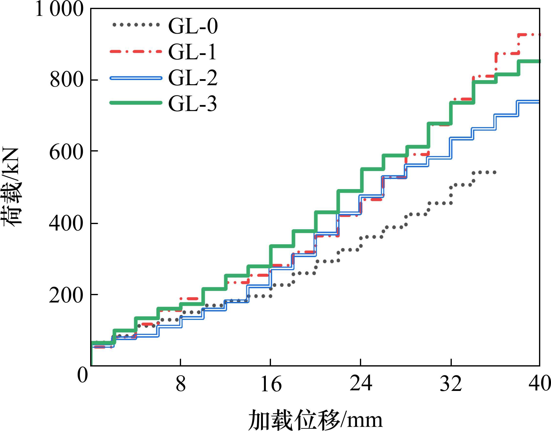 图8为2号管节错台量随加载位移的变化曲线。由图8可知,随着加载位移的增大,错台量基本呈线性增长,GL-0、GL-1、GL-2、GL-3工况最大错台量分别为27.58,25.08,27.37和26.91 mm。与GL-0工况相比,GL-1、GL-2、GL-3分别可减少10%、1%、2.5%的错台量。GL-1短螺杆比GL-2长螺杆的变形区间小,抵抗剪切错台作用更强,GL-3钢绞线与破坏后的孔壁接触效果较差,其抵抗剪切错台的作用也弱于GL-1短螺杆。这说明纵向连接件可以很好地限制管节间的错台变形,短螺杆效果最优,长螺杆效果最差。