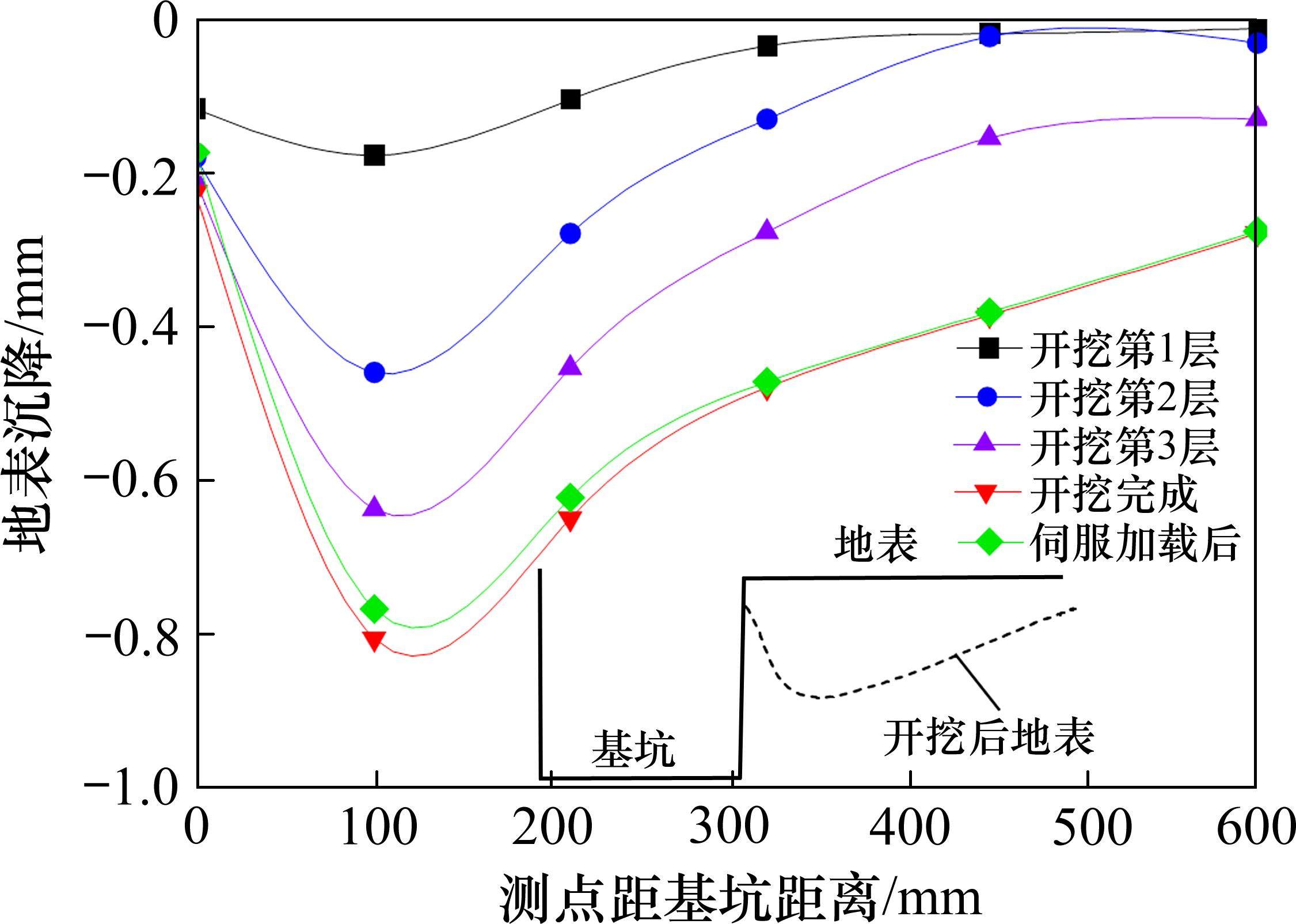 图10为地表沉降曲线,横轴表示测点距离基坑边缘距离,纵轴地表沉降为负值代表地表下沉。从图10可得出:1) 随着基坑开挖深度增大,地表沉降量逐渐增大,随着测点与地连墙距离增大,地表沉降量逐渐减小。2) 由于地连墙摩阻力的影响,距离基坑较近的测点1沉降量小于测点2,地表沉降曲线整体呈“V”形,地表沉降最大值出现在距离地连墙100 mm处的测点2,最大值为-0.805 mm。3) 伺服加载后地表沉降最大为-0.767 mm,伺服加载使最大地表沉降量减小0.038 mm,减少4.7%。上述分析表明伺服加载对地表沉降具有一定的影响,但控制效果不显著。可能原因为:伺服加载在旁侧土体产生水平方向的附加应力,因此对土体水平方向位移控制效果要显著优于地表沉降。此外,本试验伺服钢支撑的伸长量为支撑处地连墙的变形量,基坑上部地连墙变形相对底部较小,所以上部伺服钢支撑的伸长量较小,而对地表沉降的控制效果主要取决于上部的伺服加载,因此导致地表沉降量较小。此外,伺服加载在旁侧土体产生扰动,模型箱边界效应都可能产生一定的影响。