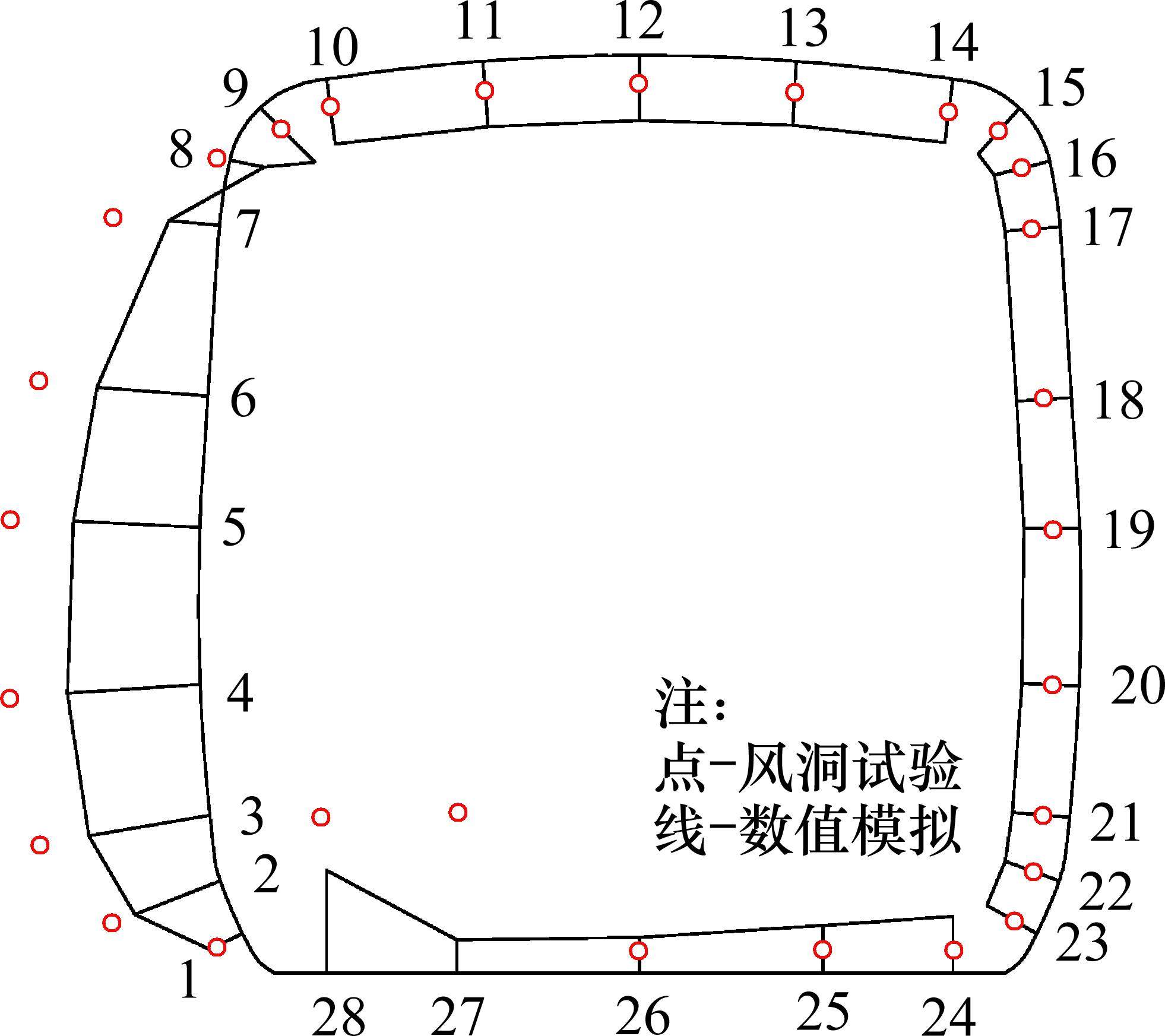 此外,通过比较数值模拟与风洞试验得到的列车断面压力系数分布,如图7所示。可见2种方式得到压力分布趋势大体一致,证明了车-桥系统网格模型的可靠性。