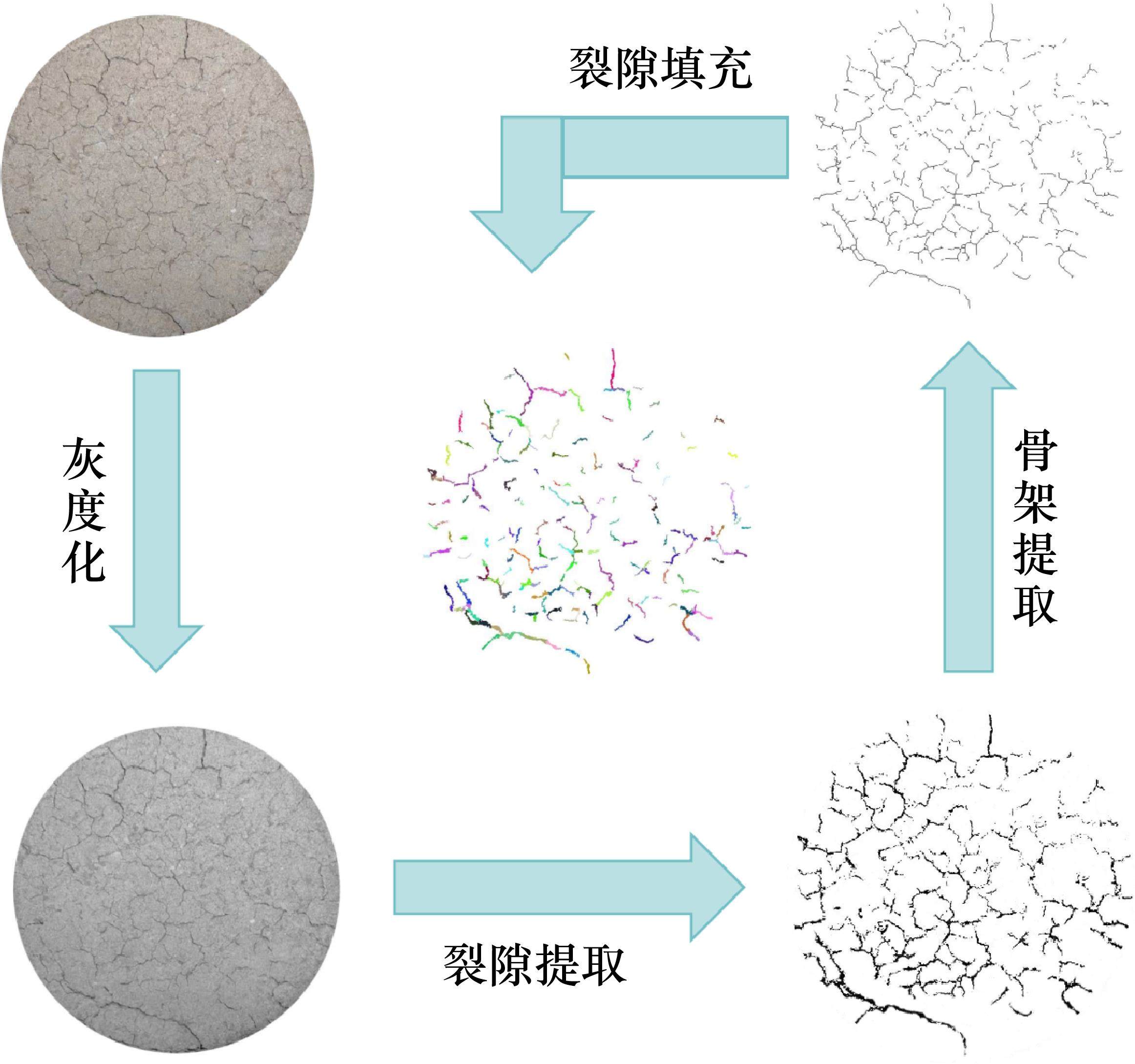 裂隙的发育与演化是在干湿循环环境下的动态过程,为了更好地总结膨胀土裂隙演化规律,将土壤裂隙发育情况裁剪至与环刀内径相切最大圆形。使用南京大学唐朝生团队开发的CIAS系统对图片进行灰度化处理,调整图片阈值、降噪(去除与土体裂隙无关杂点),提取出裂隙骨架并用不同颜色填充以此统计裂隙指标与分形维数[26-28]。试样裂隙处理流程如图5所示。选取试样每次脱湿结束后的裂隙率、裂隙总长度、裂隙平均宽度、分形维数这4个指标进行评价。