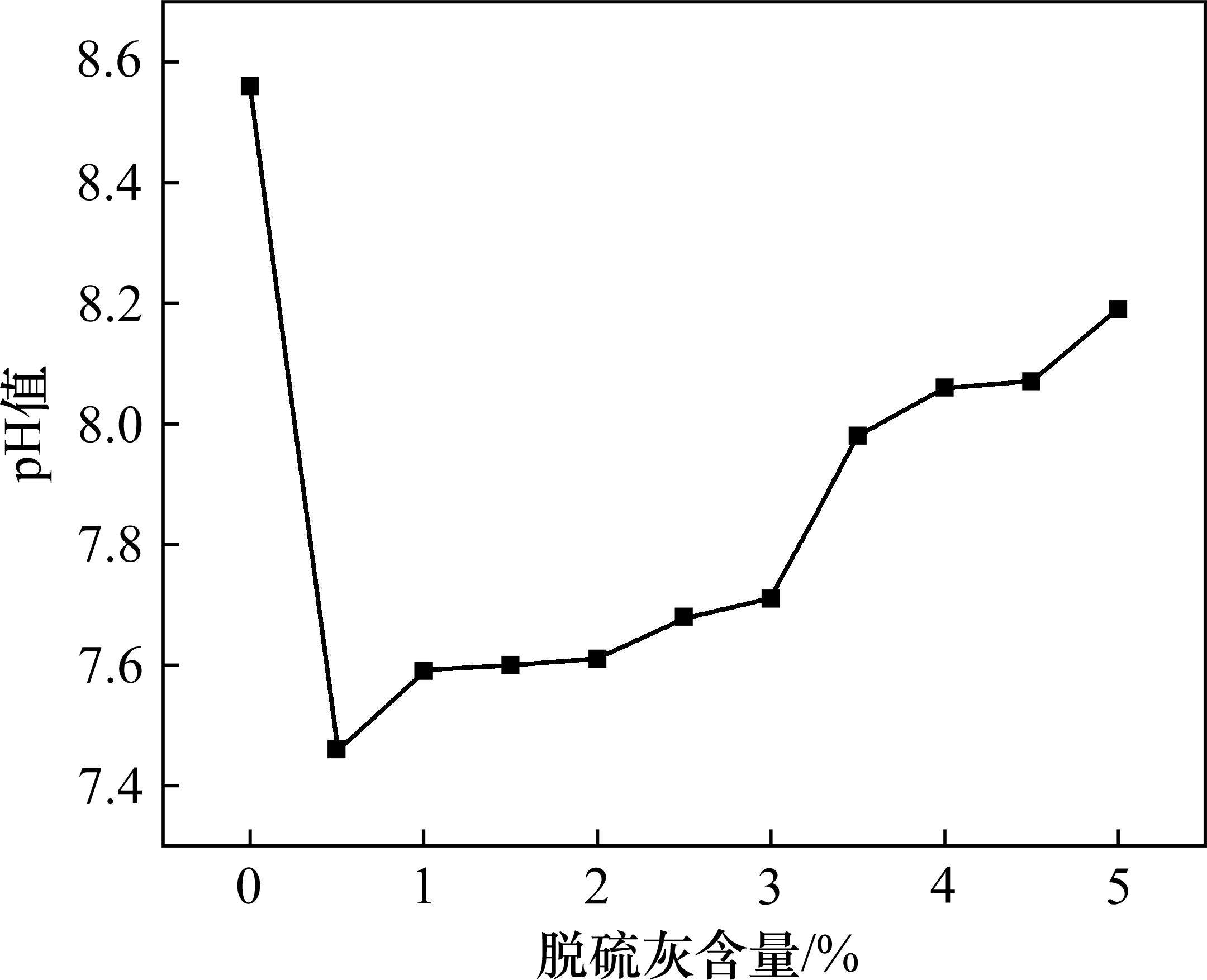 pH值是反映氢离子浓度的一种标度。脱硫灰pH值为8.49,素土pH值为8.56,如图7所示。将0.5%含量脱硫灰加入素土试样后,TL1试样pH值由8.56下降为7.46,膨胀土中氢离子浓度显著提升,这是由于脱硫灰中含有9.23%的Ca(OH)2,当Ca(OH)2溶于水后Ca2+进入蒙脱石层间,置换出蒙脱石层间的H+。随着脱硫灰含量的不断升高,土体中出现更多的Ca2+和OH-,OH-和H+生成H2O,多余的OH-保留在溶液中降低了氢离子的浓度,这一现象也与X射线衍射分析中层面间距的变化相呼应。随着碱性的逐渐增大,OH-浓度升高并与黏土矿物中硅氧四面体和铝氧八面体发生反应生成