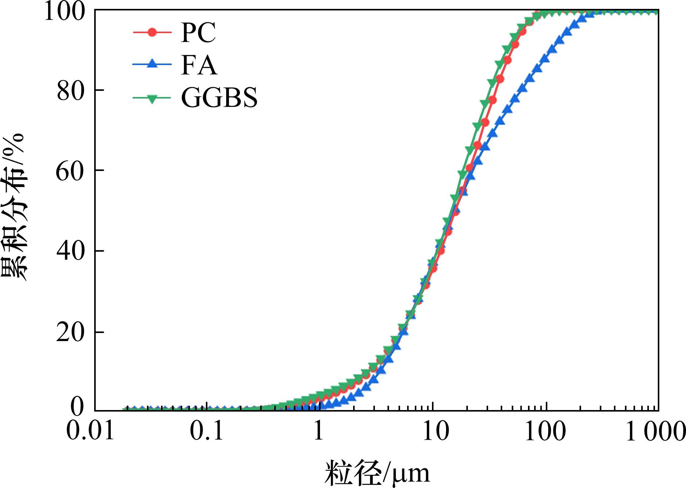 采用中国联合水泥集团有限公司生产的P.I 42.5级(PC)硅酸盐水泥,粉煤灰(FA)为湖南湘潭电厂生产的I级粉煤灰,高炉矿渣(GGBS)由萍乡钢铁厂新材料有限公司生产的S95级矿渣粉,拌合水为去离子水,砂子为ISO标准砂。表1给出了PC、FA和GGBS的化学成分,图1所示为胶凝材料的粒度分布测试结果。