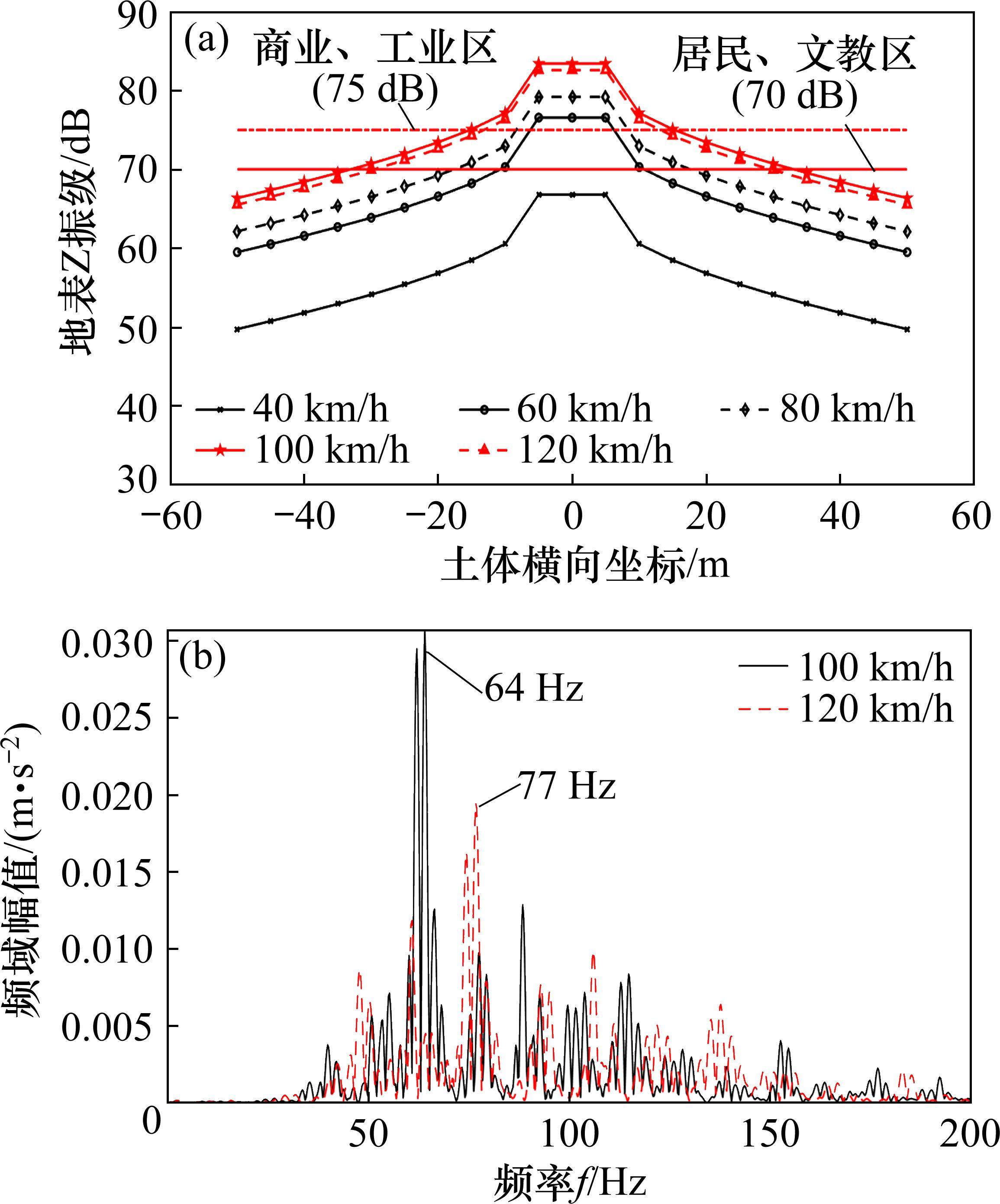 由图7(a)可知当车速由40 km/h增大到60 km/h时,地表Z振级大幅增大;40~100 km/h范围地表Z振级随车速的增大而增大,120 km/h时地表Z振级减小。根据GB10070-88城市各类区域垂向Z振级标准值[21]划分商业、工业区建筑室内Z振级不得超过75 dB,居民、文教区建筑室内Z振级为70 dB。规范定义的建筑室内Z振级测点布置在建筑一楼室内或建筑物外墙0.5 m范围内,可以认为与地表Z振级的大小一致。对于居民、文教区,距线路中心35 m外各车速对应室内Z振级都在标准值以下,车速在80 km/h以下时,距线路中心20 m外室内Z振级均低于标准值;对于商业、工业区,距线路中心18 m外各车速对应室内Z振级都在标准值以下;当车速在80 km/h及以下时,距线路中心10 m外室内Z振级都在标准值以下。