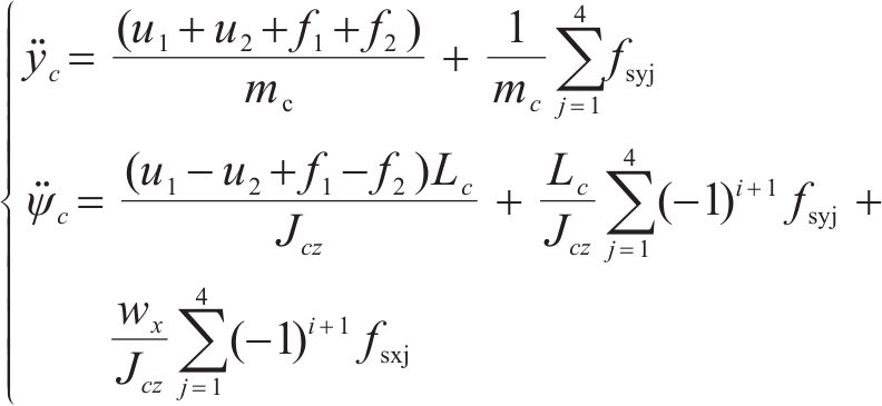 式中:u1、u2分别为车体前端左侧、后端右侧二系横向减振器主动控制力;f1、f2分别为车体前端右侧、后端左侧二系横向减振器被动控制力;mc为车体质量;fsyj、fsxj分别为二系空气弹簧产生的横向力和纵向力,j=1,2,3,4;Lc为前后二系横向减振器纵向跨距之半;Jcz为车体摇头转动惯量;wx为左右二系空气弹簧跨距之半。