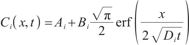 where Ci(x, t) expresses the concentration at a certain thickness (x) depending on time (t) and temperature (T). Di describes the diffusion coefficient. Ai and Bi are constants.