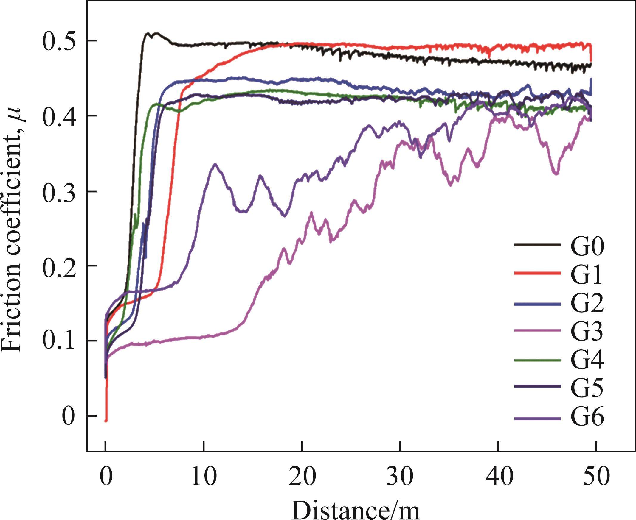 Wear tests were conducted on the TiN-coated samples taken from the punch’s working region. This choice was made to examine the wear behavior under conditions resembling the practical application of the tool with the coating. In Figure 6, the friction coefficient vs test distance graph was given. The data were filtered to highlight the trend. The untreated punch (G0) showed the highest friction coefficient, while the samples soaked for 36 h (G3 and G6) showed the lowest friction coefficient. It is evident that as long as TiN coating maintains its integrity, it provides a lower friction coefficient of approximately 0.2-0.3 when in contact with the WC ball. However, as the coating wears off, a significant increase in friction coefficient is observed when the HSS material interacts with the WC ball. The observed friction increase in the G3 sample over 20 m of tests proves this theory, and as the test proceeds, the friction coefficients increase and come close to other samples.