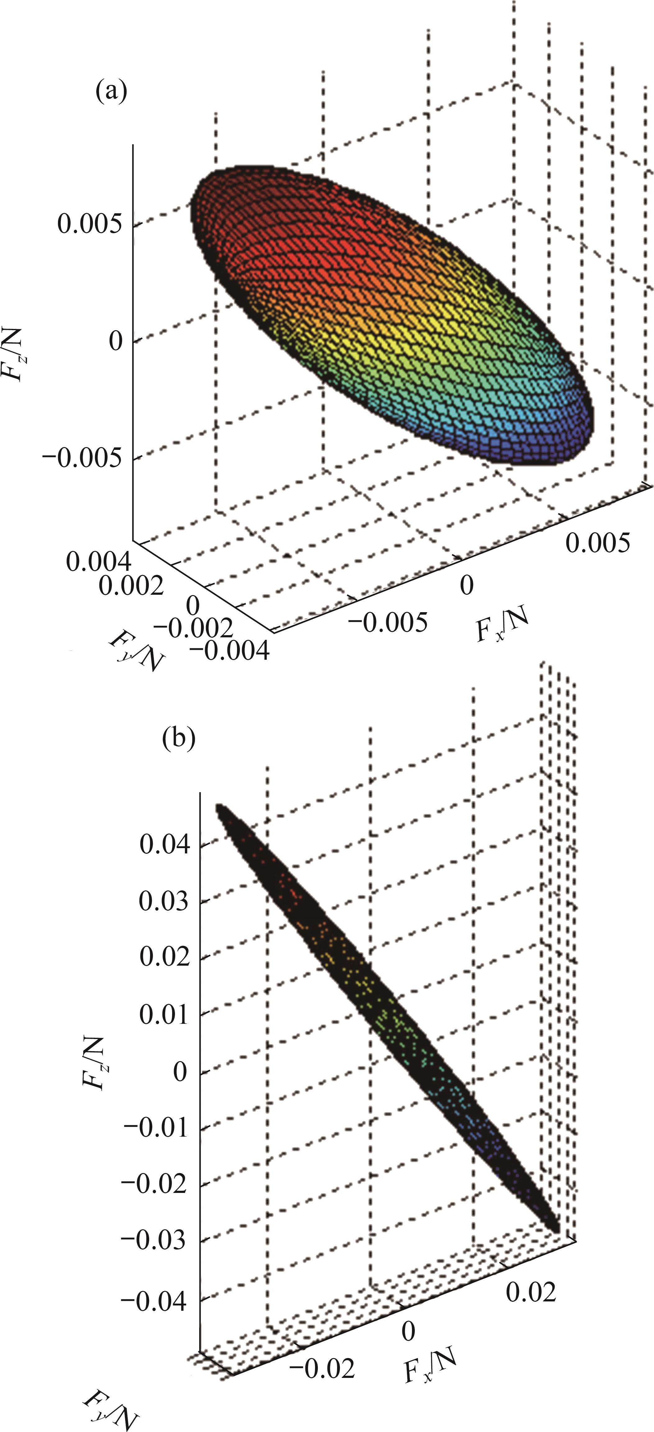 2种模式下足端的工作空间力椭球如图13所示。从图13可知:在类昆虫式和类哺乳动物式下,足端的空间力都不是各向同性的,尤其是类哺乳动物式,各个方向相差较大。机器人单腿的主要运动在x-z平面内进行,因此,将力椭球投影到 x-z平面内,结果如图14所示。