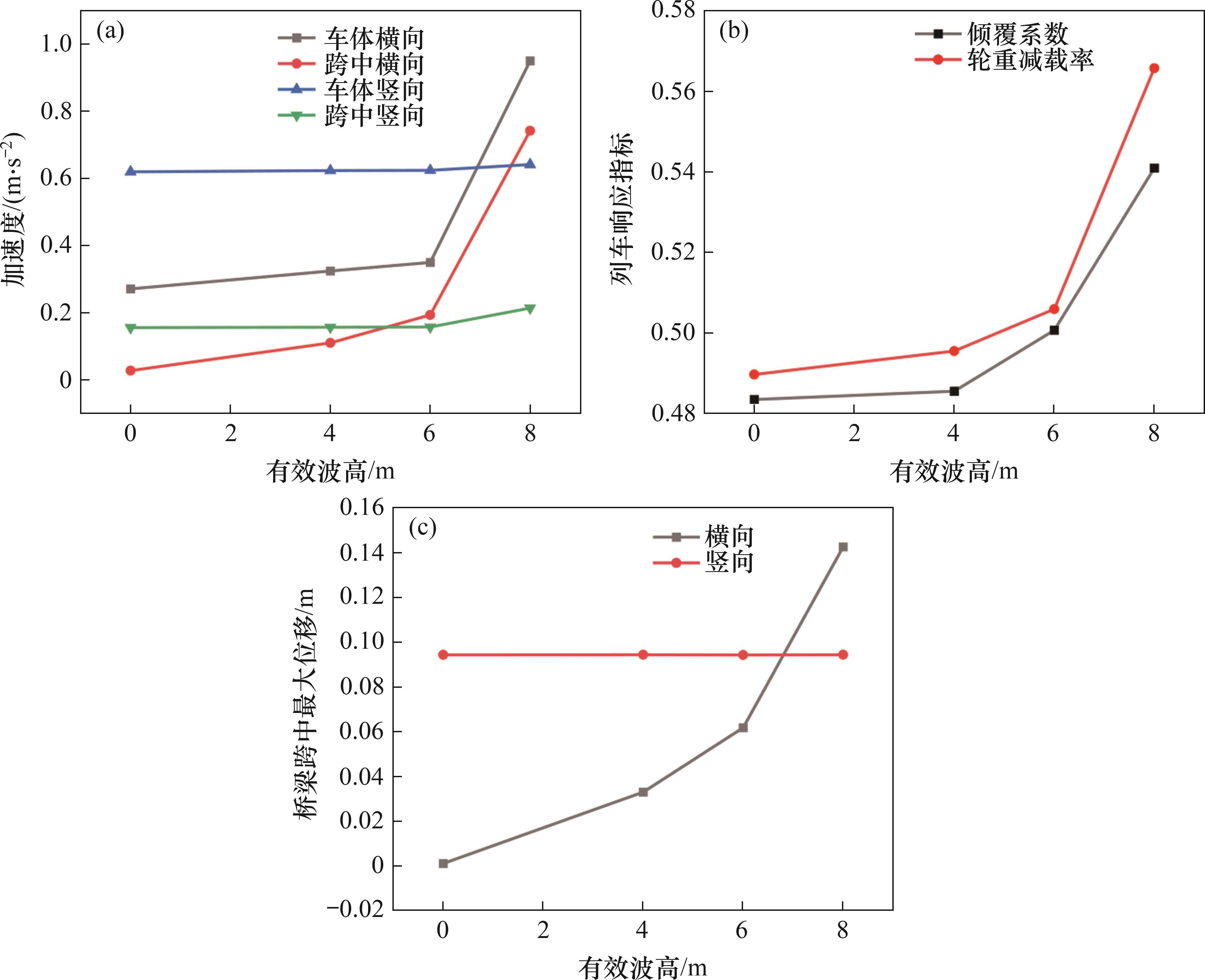 1) 随着有效波高增大,车桥动力响应有所增大,其中,主梁跨中横向位移、横向振动加速度、列车横向加速度、轮重减载率、倾覆系数等增长显著,而主梁跨中竖向振动加速度、列车竖向振动加速度、主梁跨中竖向位移增幅较小。由于波浪荷载为横桥向作用,桥塔产生横向弯曲,主要使主梁产生横向振动。